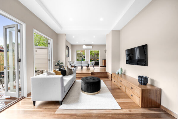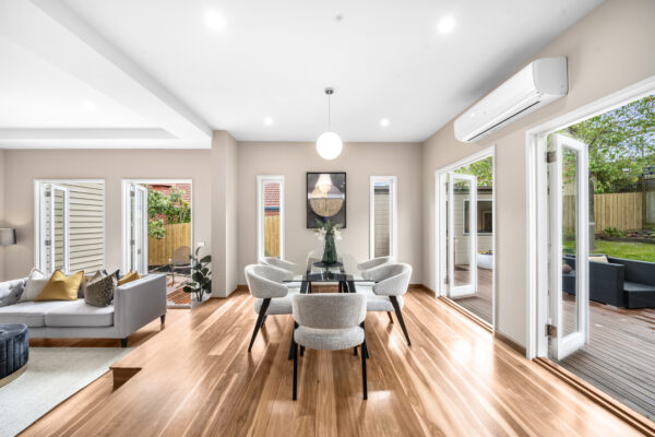 Inside, the home boasts light-filled interiors, with the kitchen, dining, and alfresco deck all facing north to capture natural light throughout the day. French doors flood the living and dining areas with light from every angle, creating a warm and inviting atmosphere. A modern kitchen with premium appliances, polished floorboards, built-in robes, and heating/cooling further enhance the home’s functionality and comfort. The inviting alfresco deck seamlessly extends to the lush garden — a perfect backdrop for entertaining or relaxed family living.