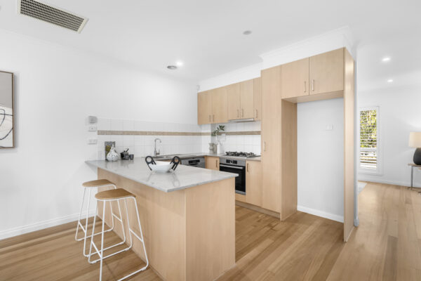 Step inside to discover polished Tasmanian Oak floors, a soft neutral palette, and quality finishes throughout. The stylish kitchen/meals area features Caesarstone benchtops, stainless steel appliances, and views to the private courtyard—perfect for entertaining or quiet relaxation. The inviting living room is filled with natural light, offering a warm and welcoming space to unwind.