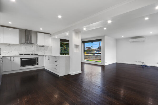 The open-plan living area is filled with natural light and features a split system for heating and cooling, ensuring comfort throughout the year. The adjoining kitchen offers excellent bench and cupboard space, making it ideal for home cooking and family meals.
