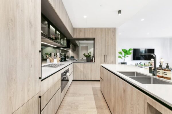 The contemporary kitchen is equipped with stone benchtops, integrated appliances including a fridge/freezer, and ample storage. Just off the kitchen is a generous walk-in laundry, offering added practicality and convenience. The kitchen and living areas flow seamlessly into a light-filled dining and lounge space, with sliding doors opening to a large private courtyard—perfect for outdoor entertaining or relaxing in a peaceful, leafy setting.